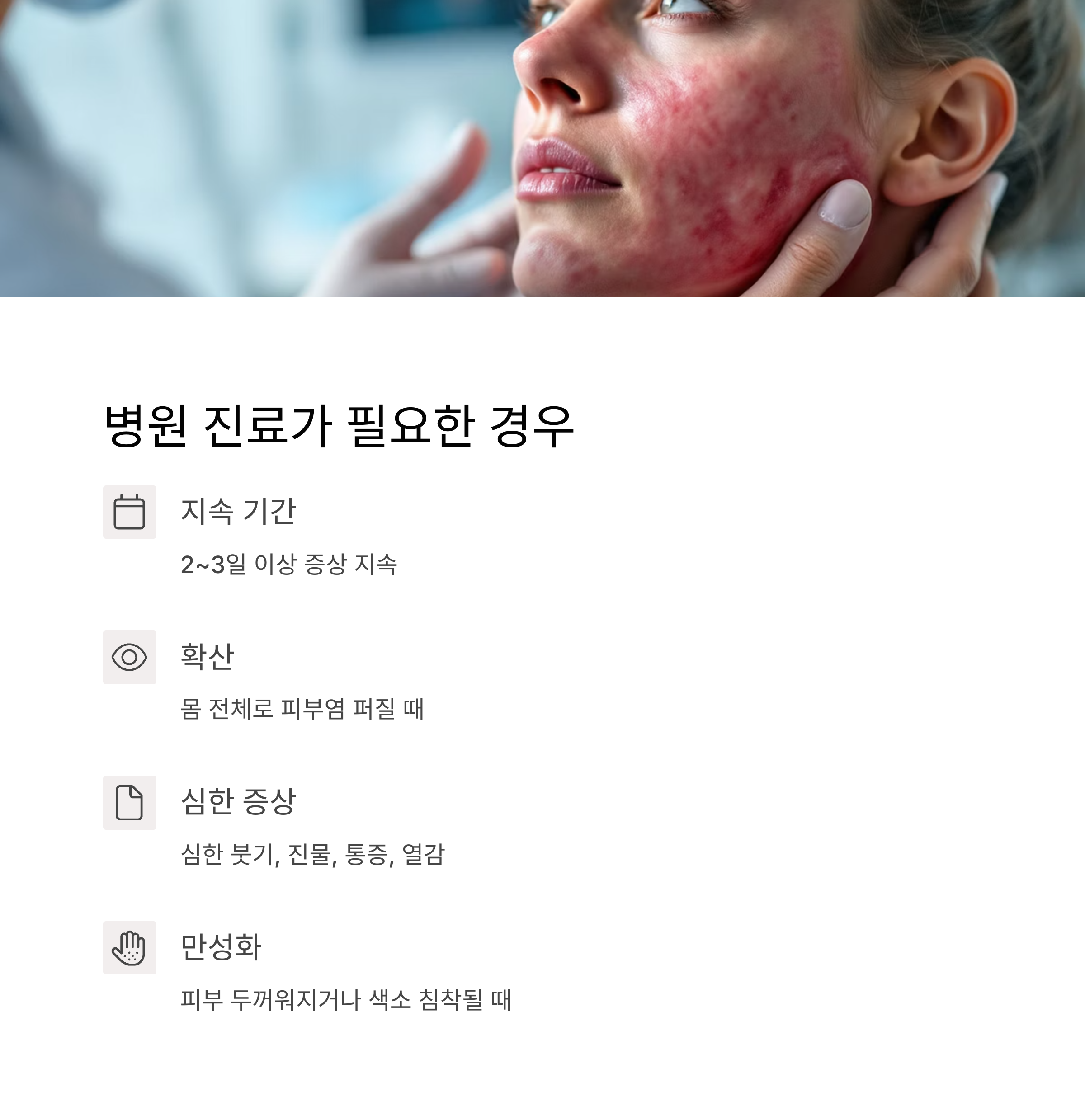 병원 진료 | 증상 지속, 전신 확산, 진물·부종 심화, 만성화 시 |