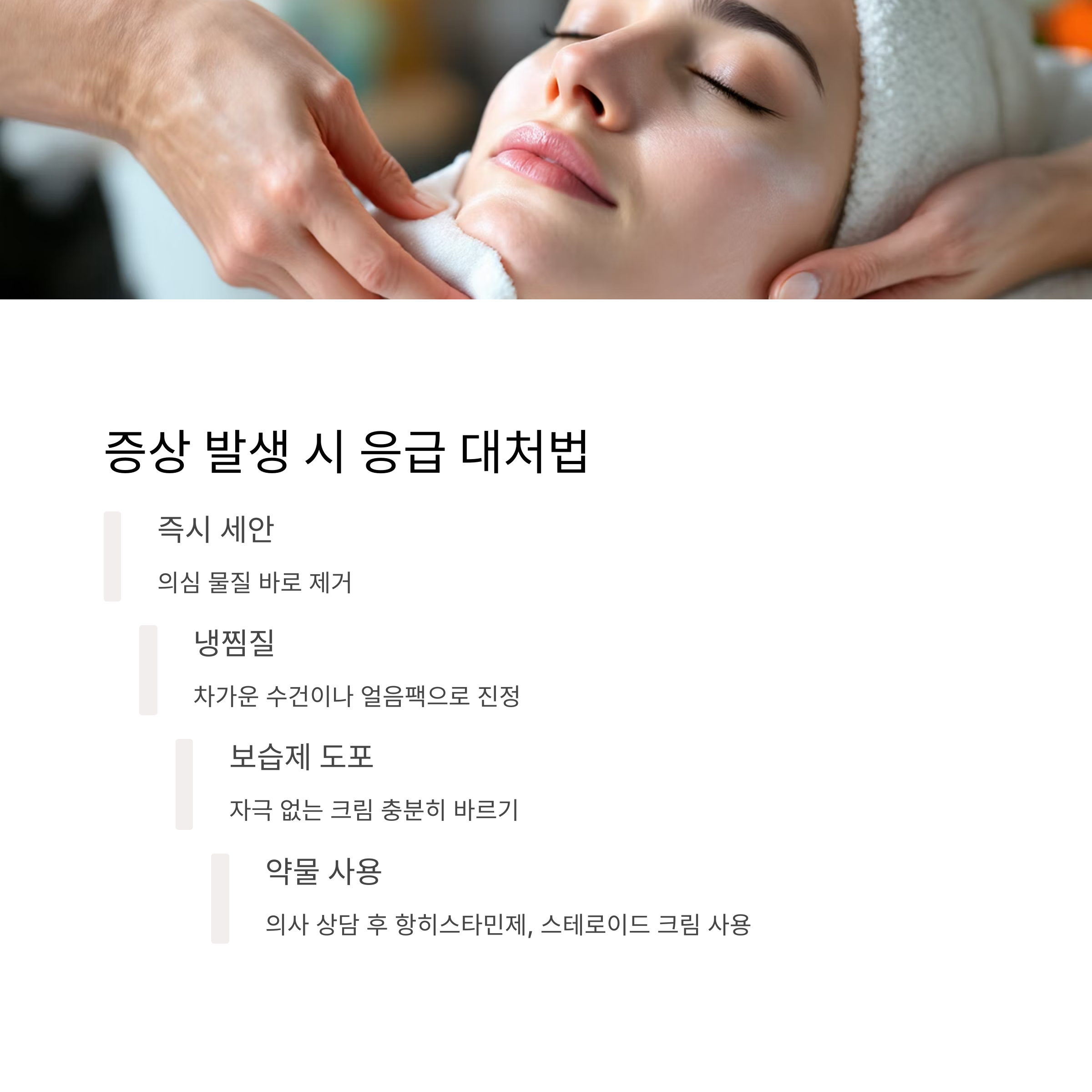 증상 발생 시 | 즉시 세안, 냉찜질, 보습제, 항히스타민제·스테로이드제 (필요 시) |