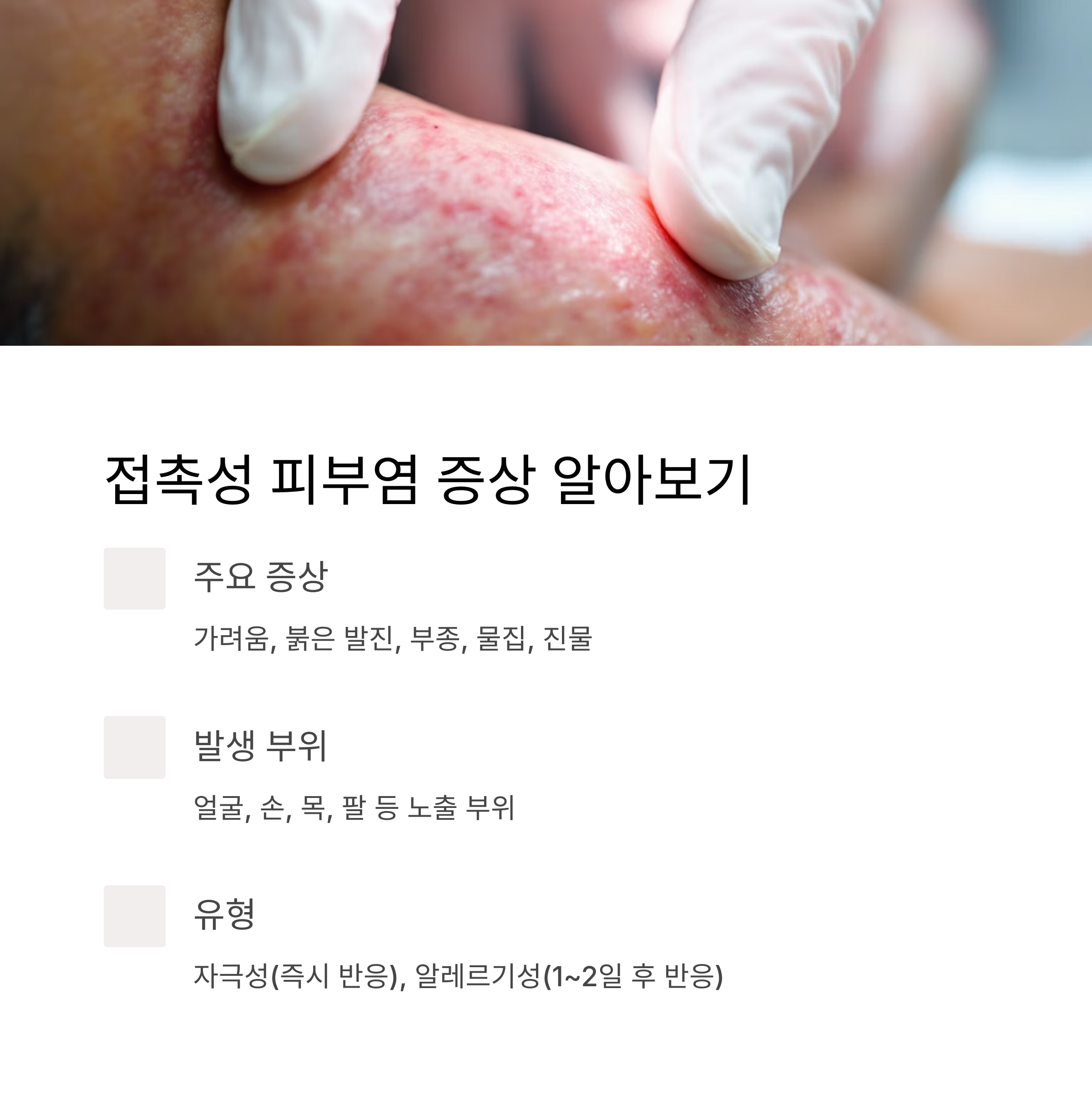 - 자극성 피부염: 자극 물질 접촉 직후 반응 발생