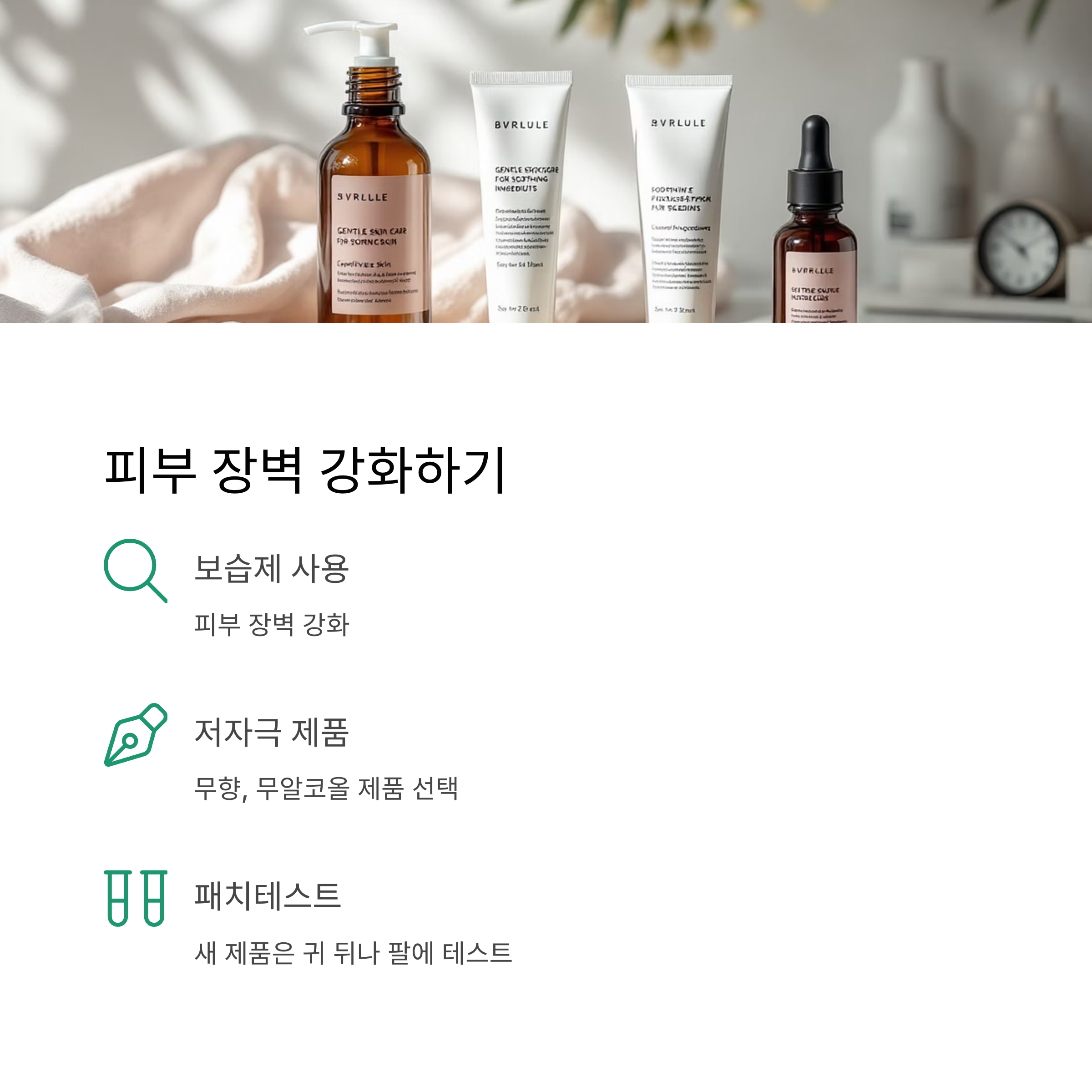 - 자극 적은 제품 선택: 무향, 무알코올, 저자극 스킨케어 제품 사용