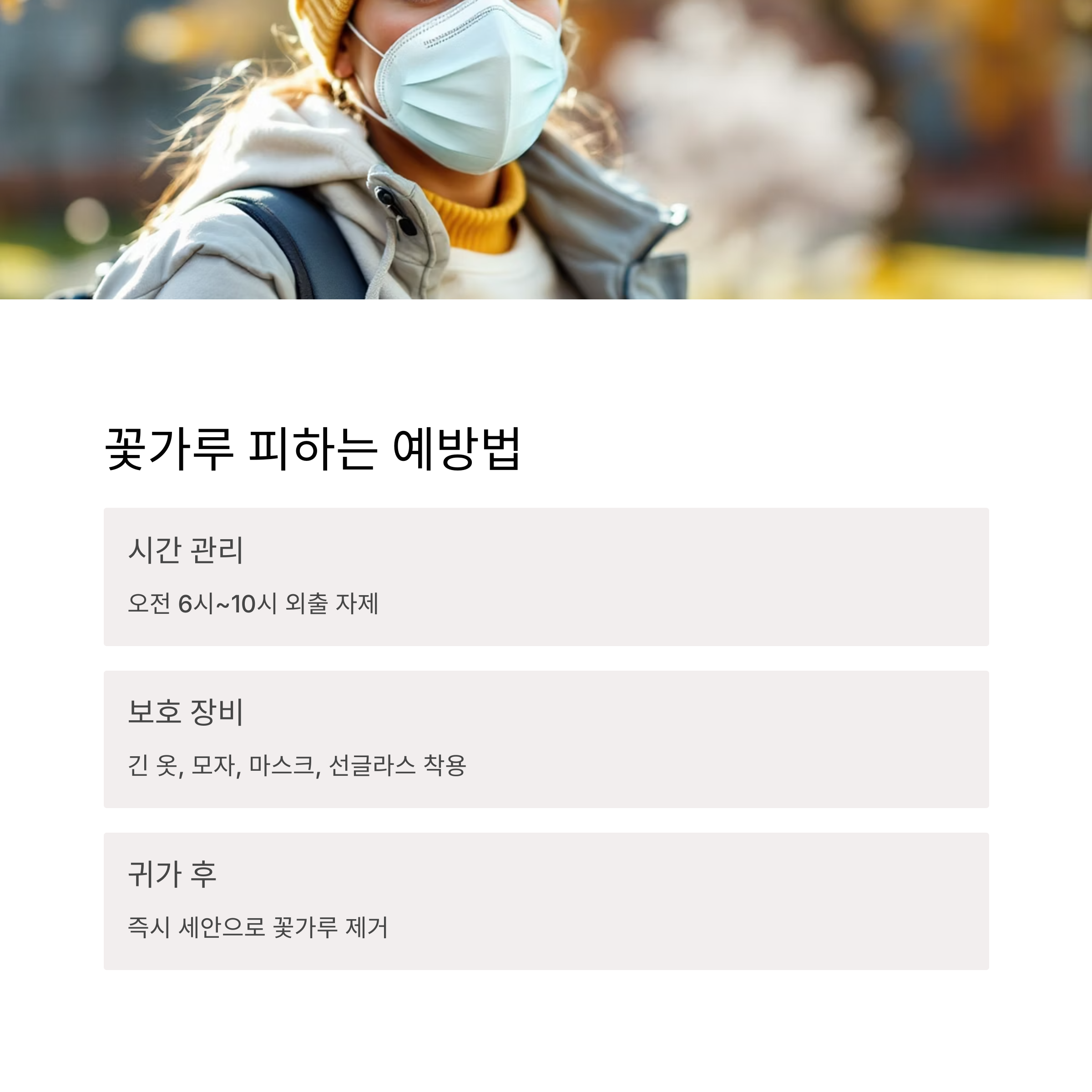 | 예방 | 꽃가루 시간 피하기, 보호구 착용, 귀가 후 세안, 보습 |