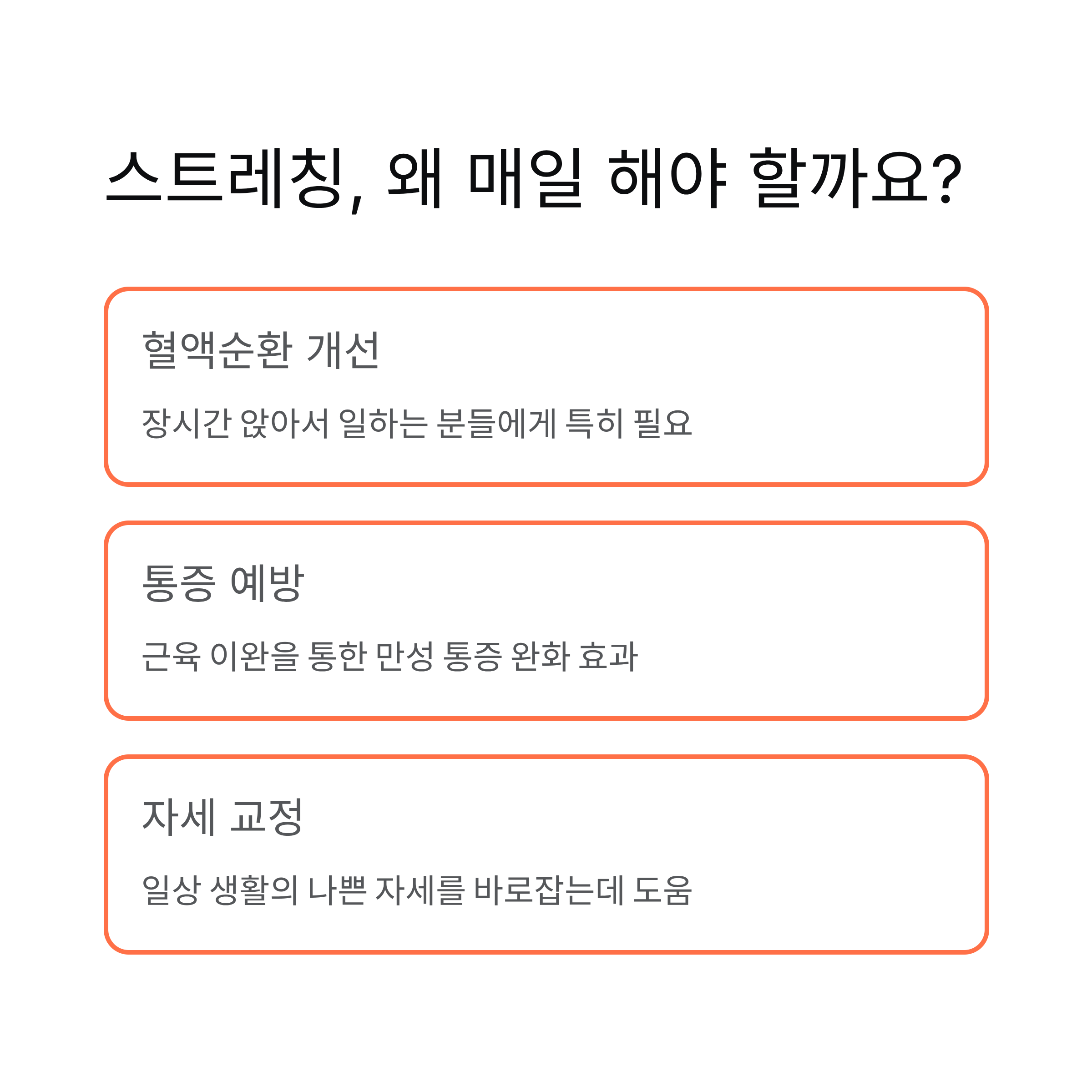 스트레칭은 단순한 근육 이완을 넘어 혈액순환 개선, 통증 예방, 자세 교정에 큰 효과가 있습니다.