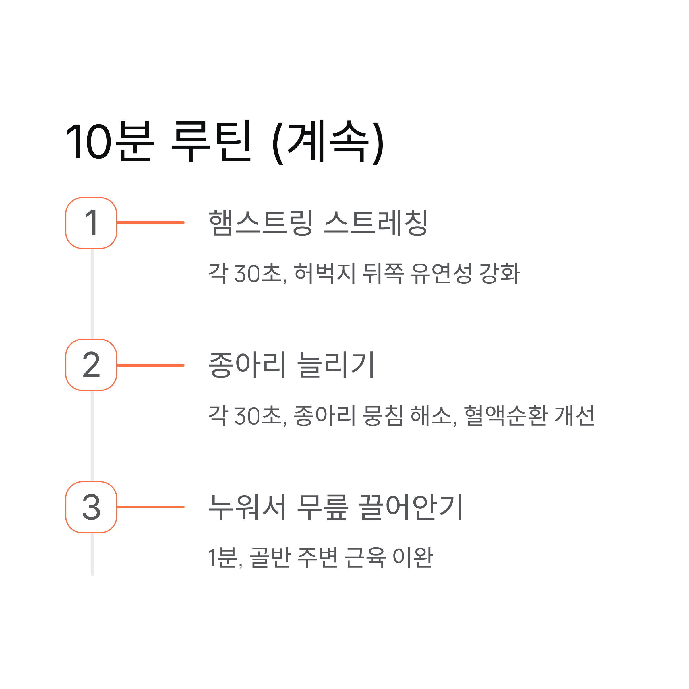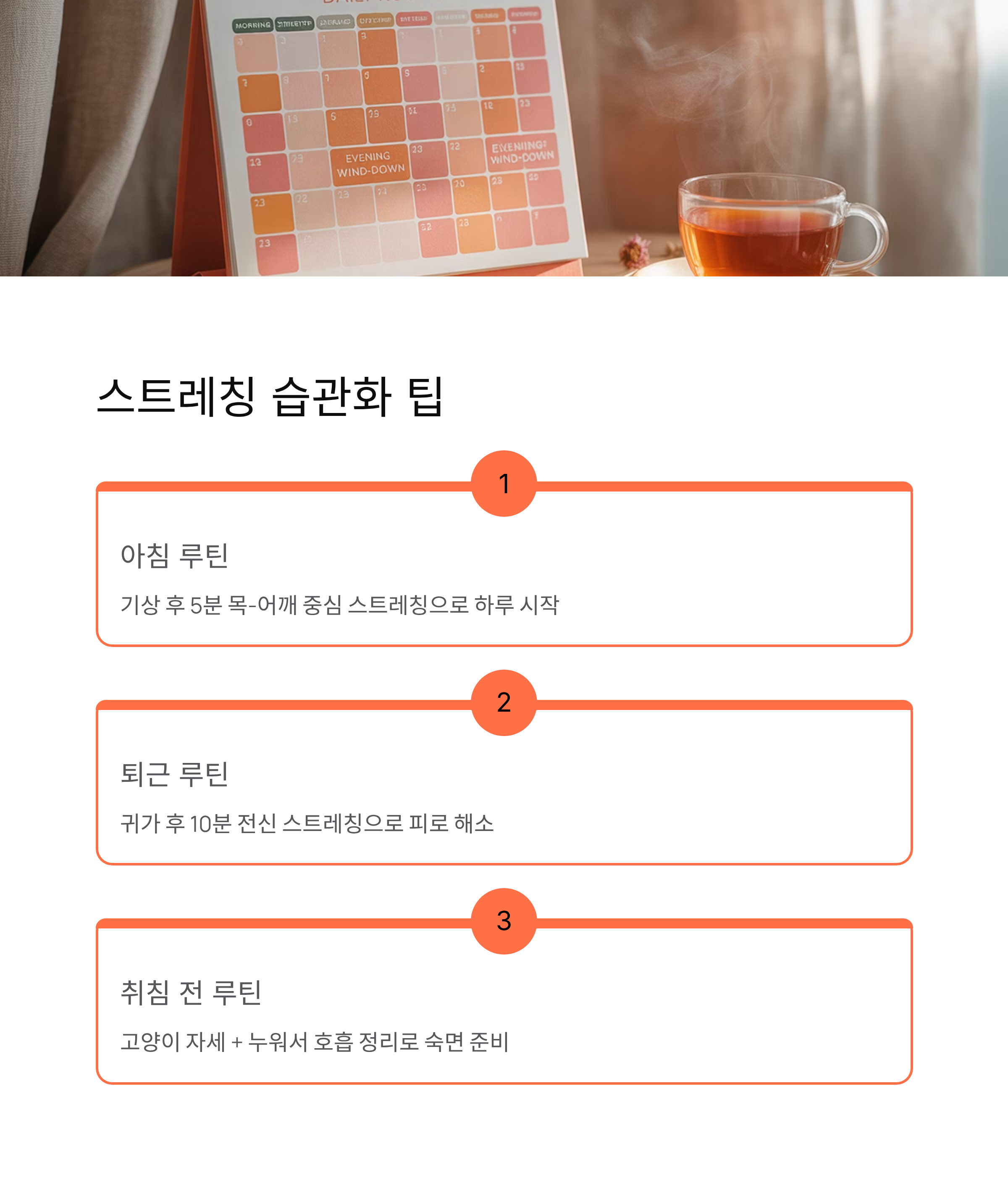 • 퇴근 루틴: 귀가 후 10분 전신 스트레칭