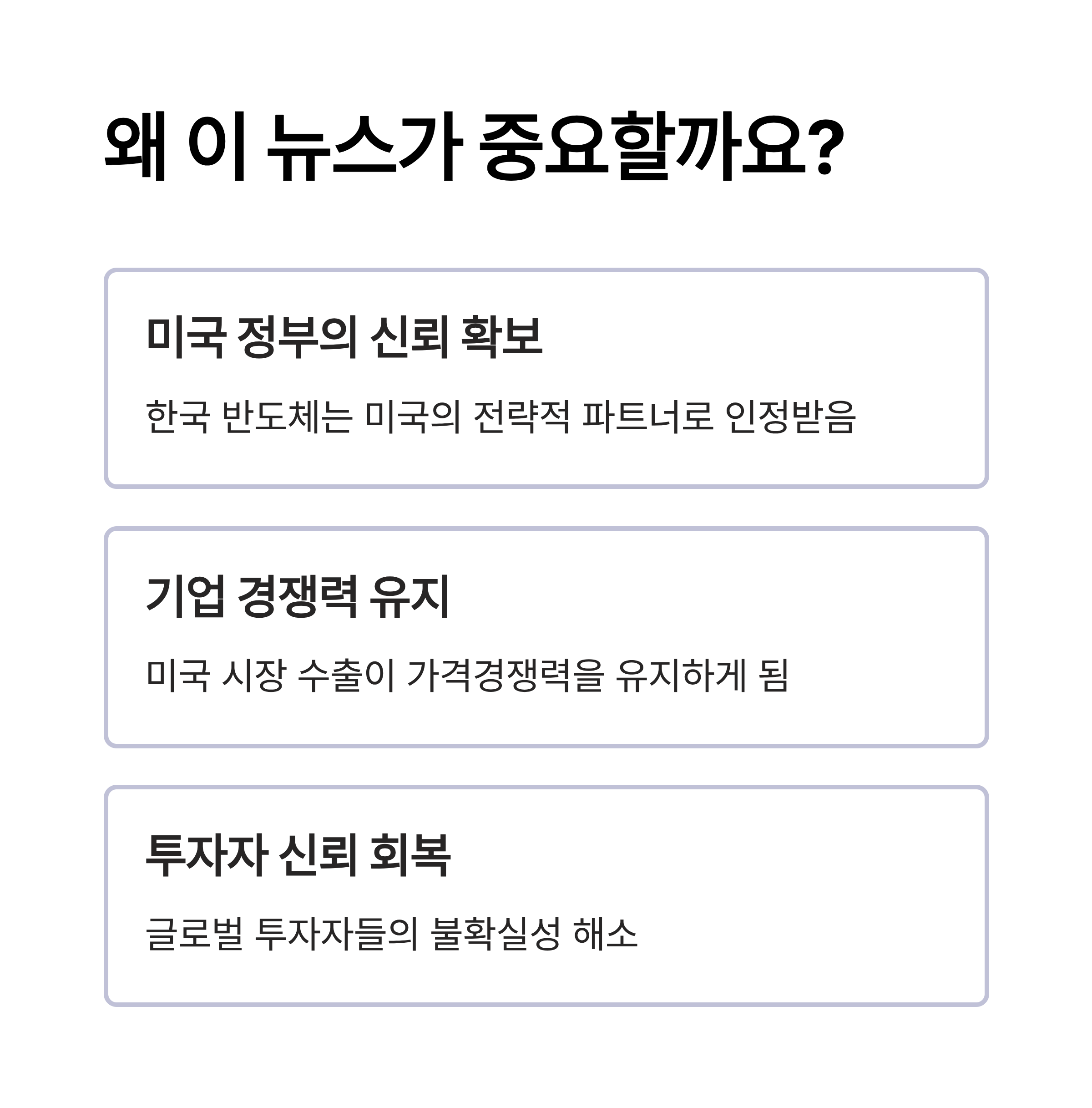 - ✅ 기업 경쟁력 유지: 미국 시장 수출이 가격경쟁력을 유지하게 됨