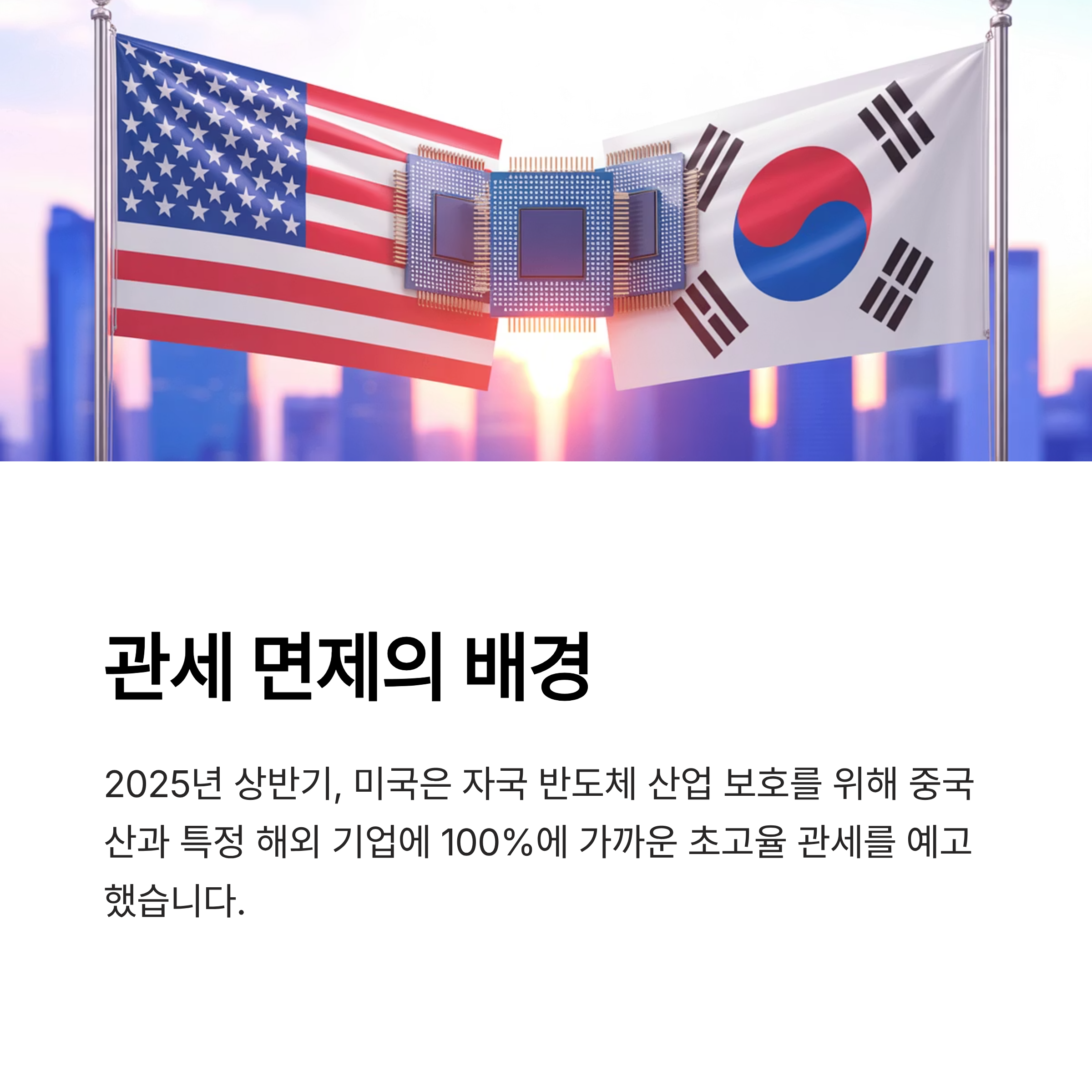 2025년 8월, 미국이 삼성전자와 SK하이닉스의 반도체에 대한 100% 관세 부과를 면제했습니다. 이는 글로벌 반도체 산업은 물론, 국내 투자자들에게도 매우 중요한 뉴스입니다.