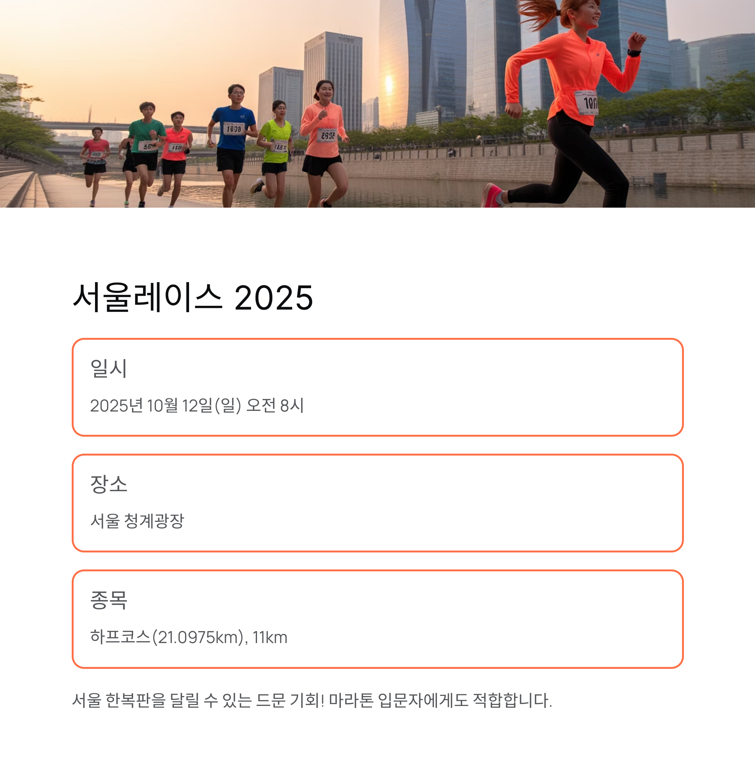 서울레이스는 서울 한복판을 달릴 수 있는 드문 기회입니다. 참가 기념품, 완주 메달, 기록 측정까지 깔끔하게 갖춰져 있어 마라톤 입문자에게도 적합하죠.