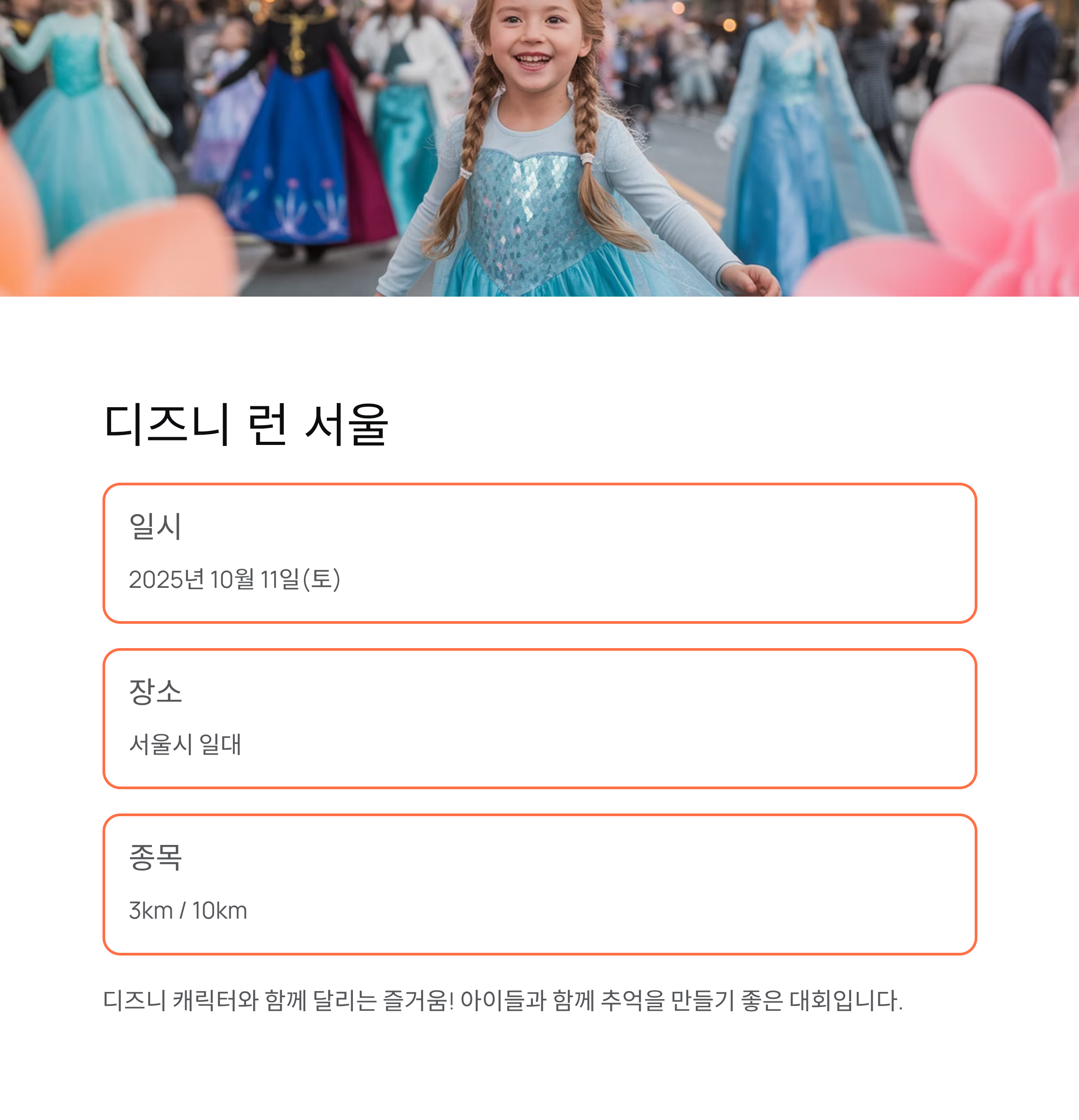 • 특징: 디즈니 캐릭터 테마 / 참가자 전용 굿즈 / 키즈 참가 가능
