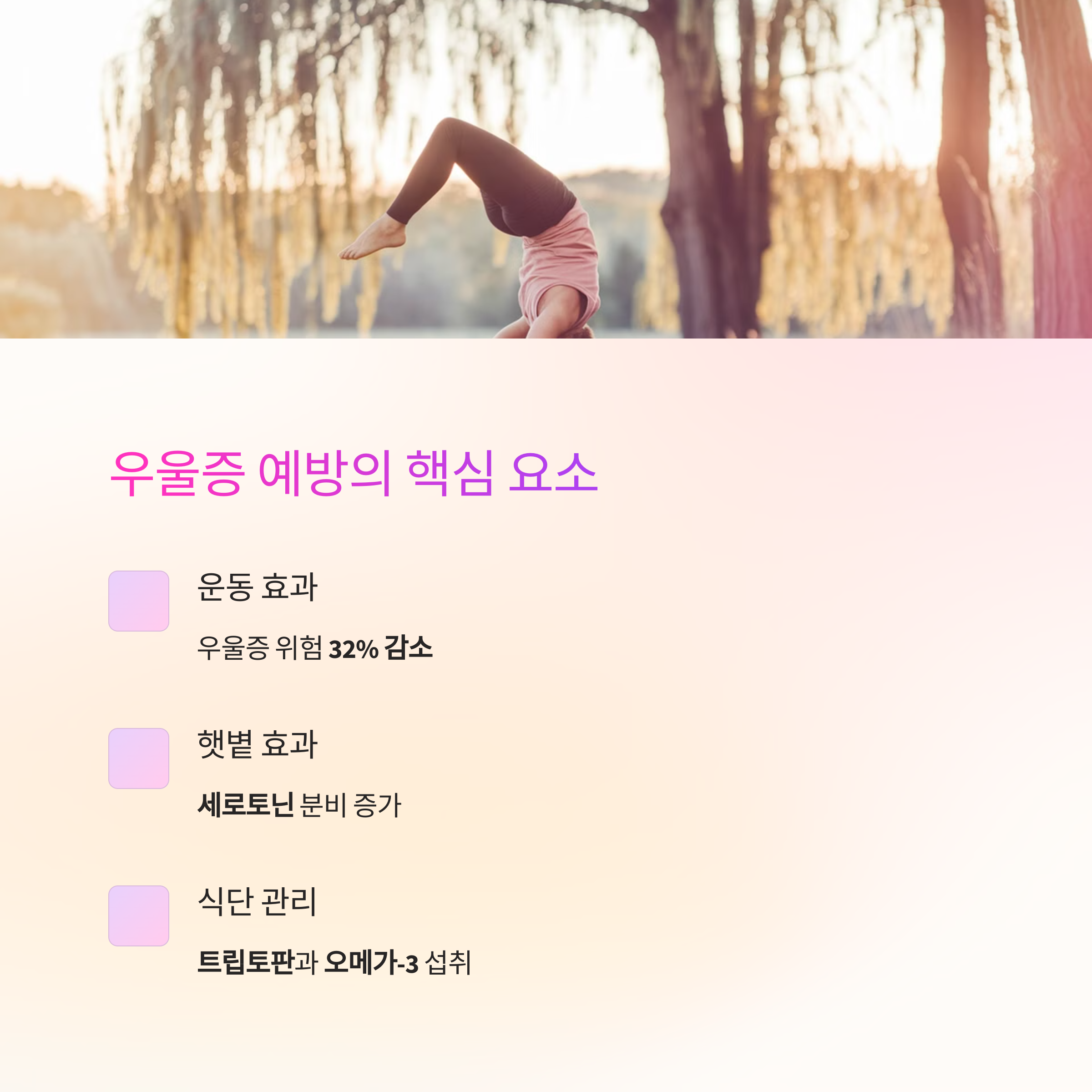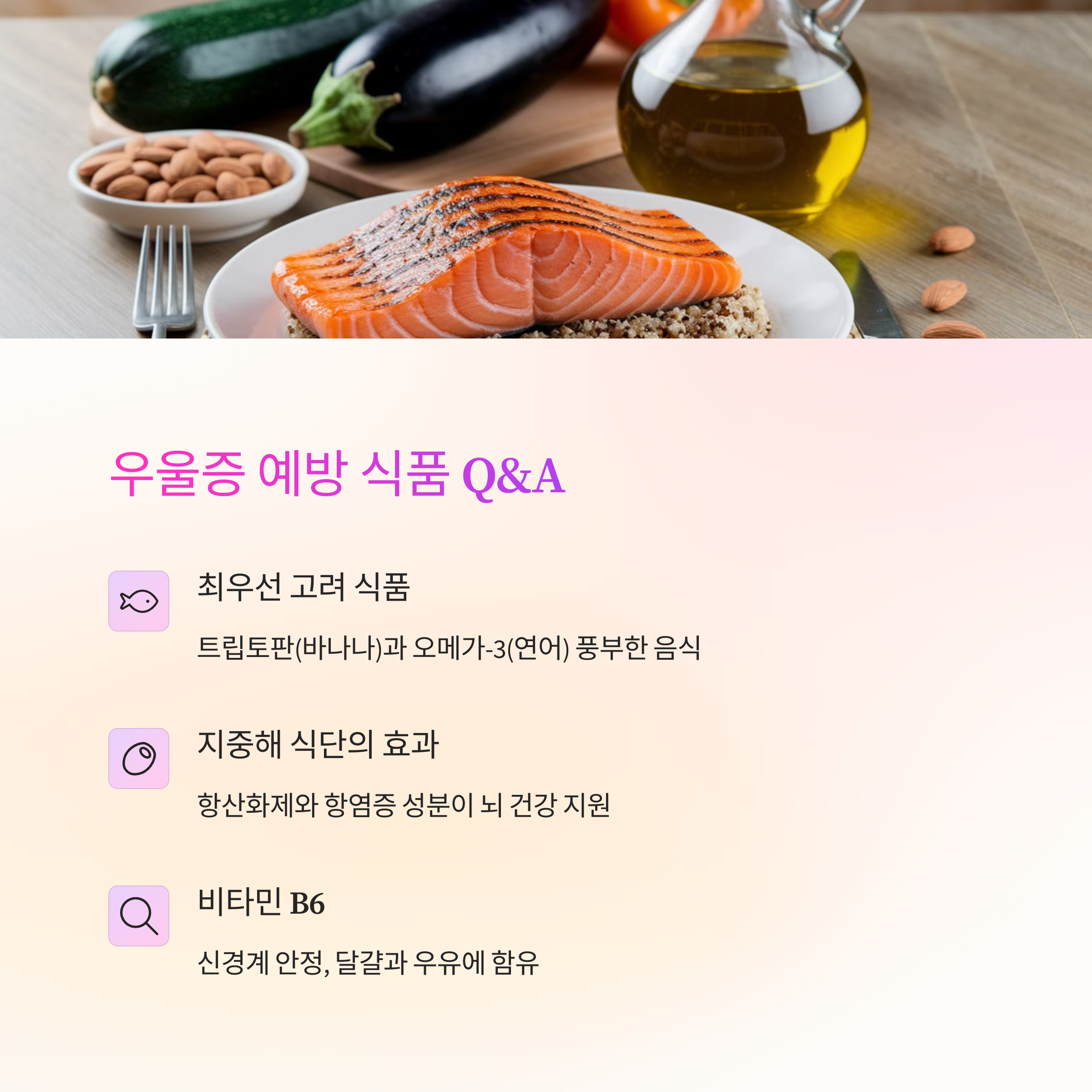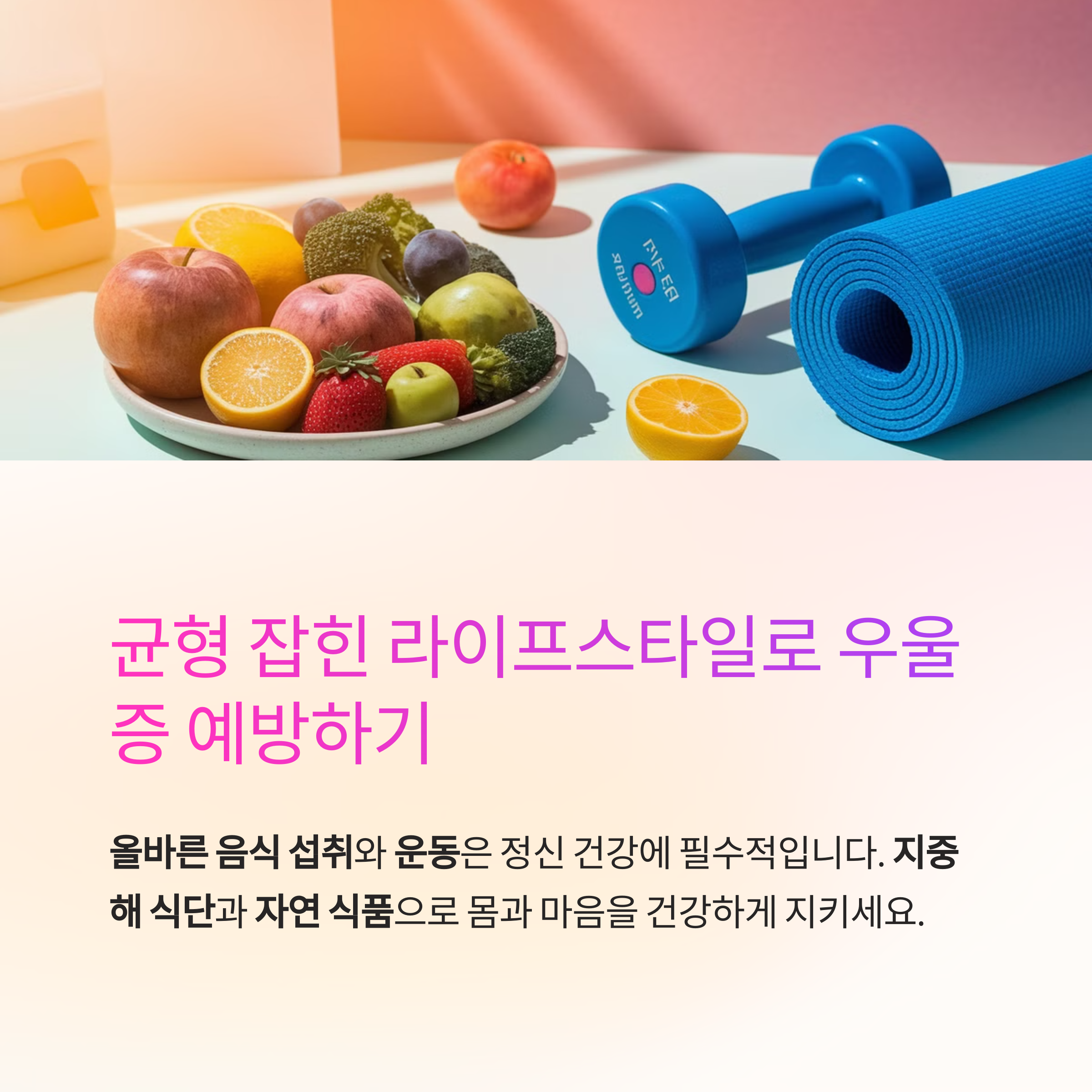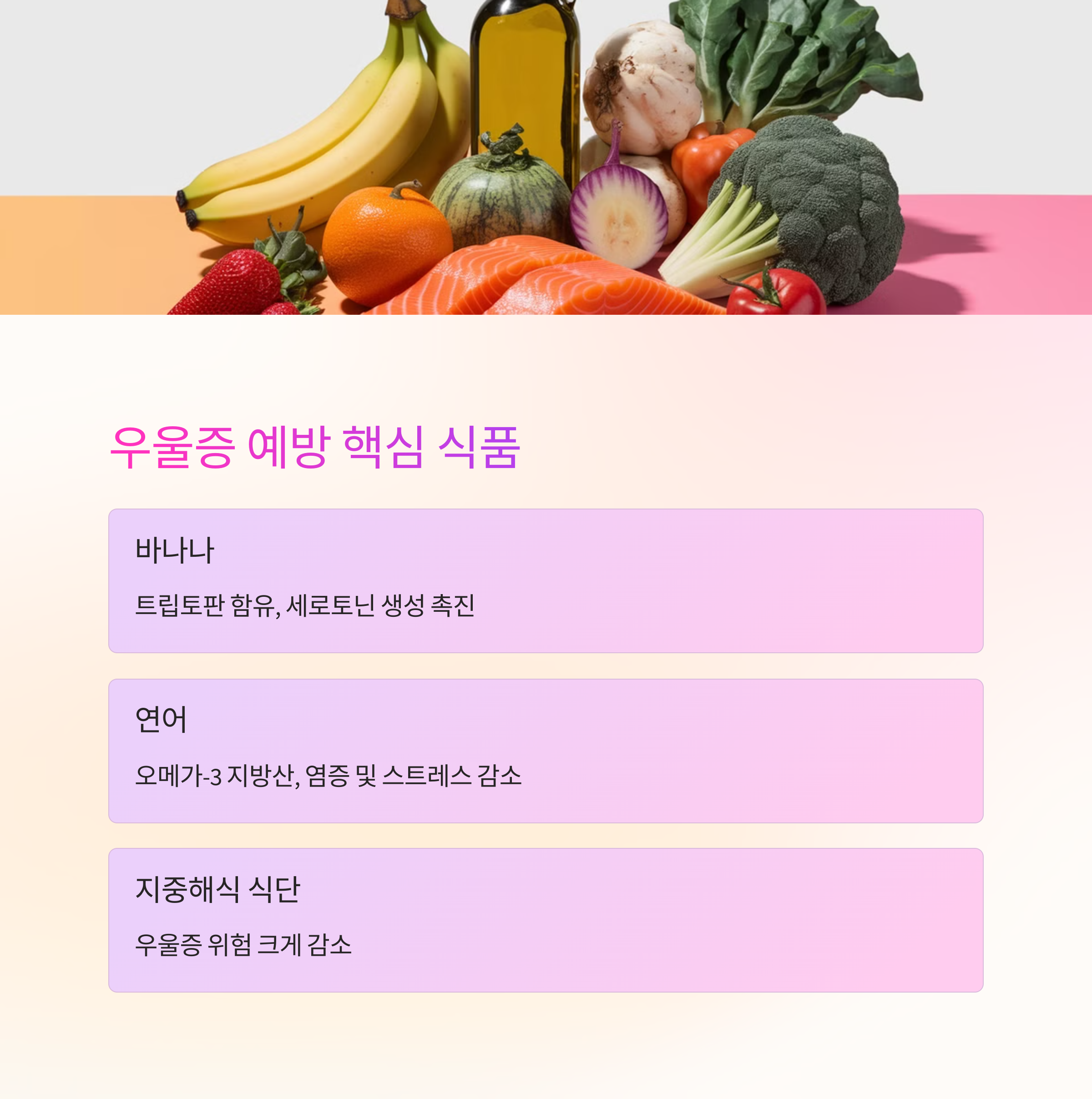 #우울증예방, #지중해식단, #건강식단, #트립토판음식, #오메가3, #정신건강관리, #운동효과