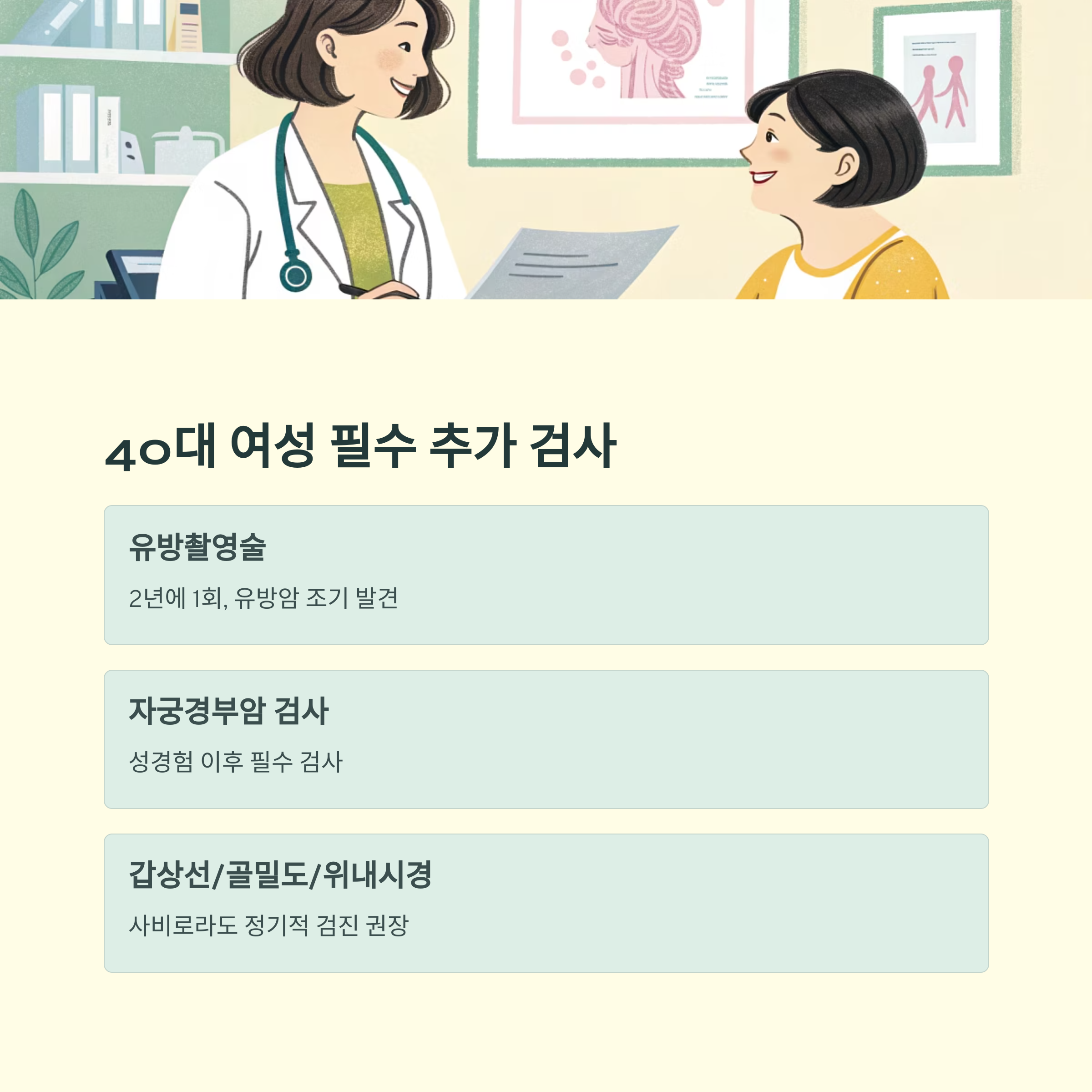 일반 검진 외에도, 40대 여성이라면 아래 항목들은 별도로 챙기는 것이 좋습니다.