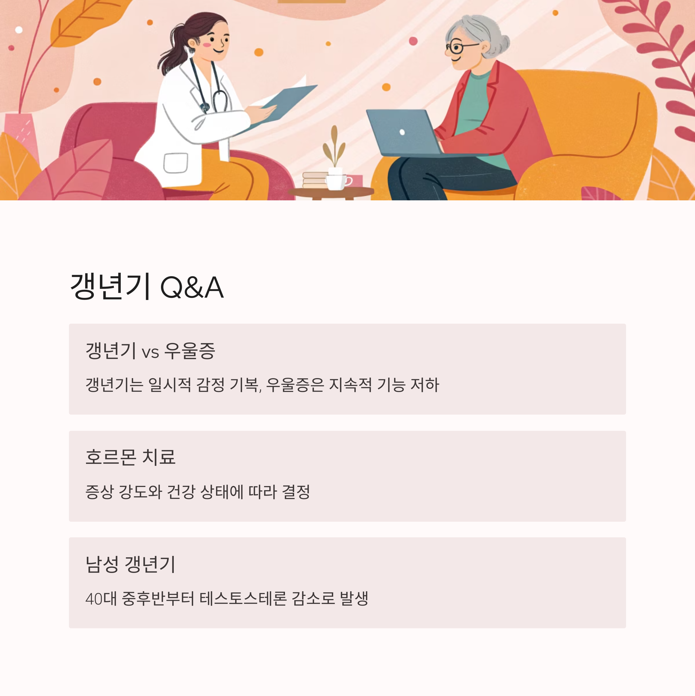 A. 갱년기는 호르몬 변화로 인해 일시적인 감정 기복이 많습니다. 우울증은 그 감정이 오래 지속되고, 일상 기능 저하까지 동반되는 경우가 많습니다.