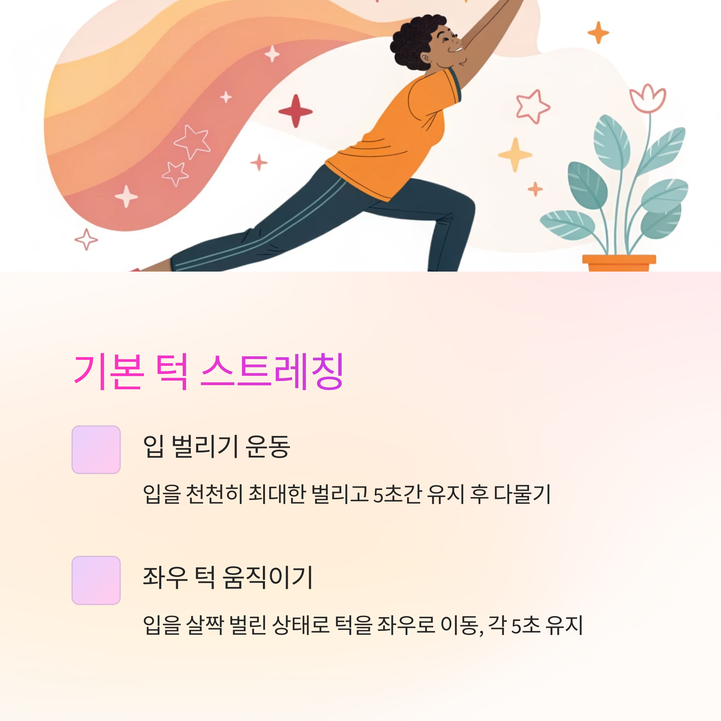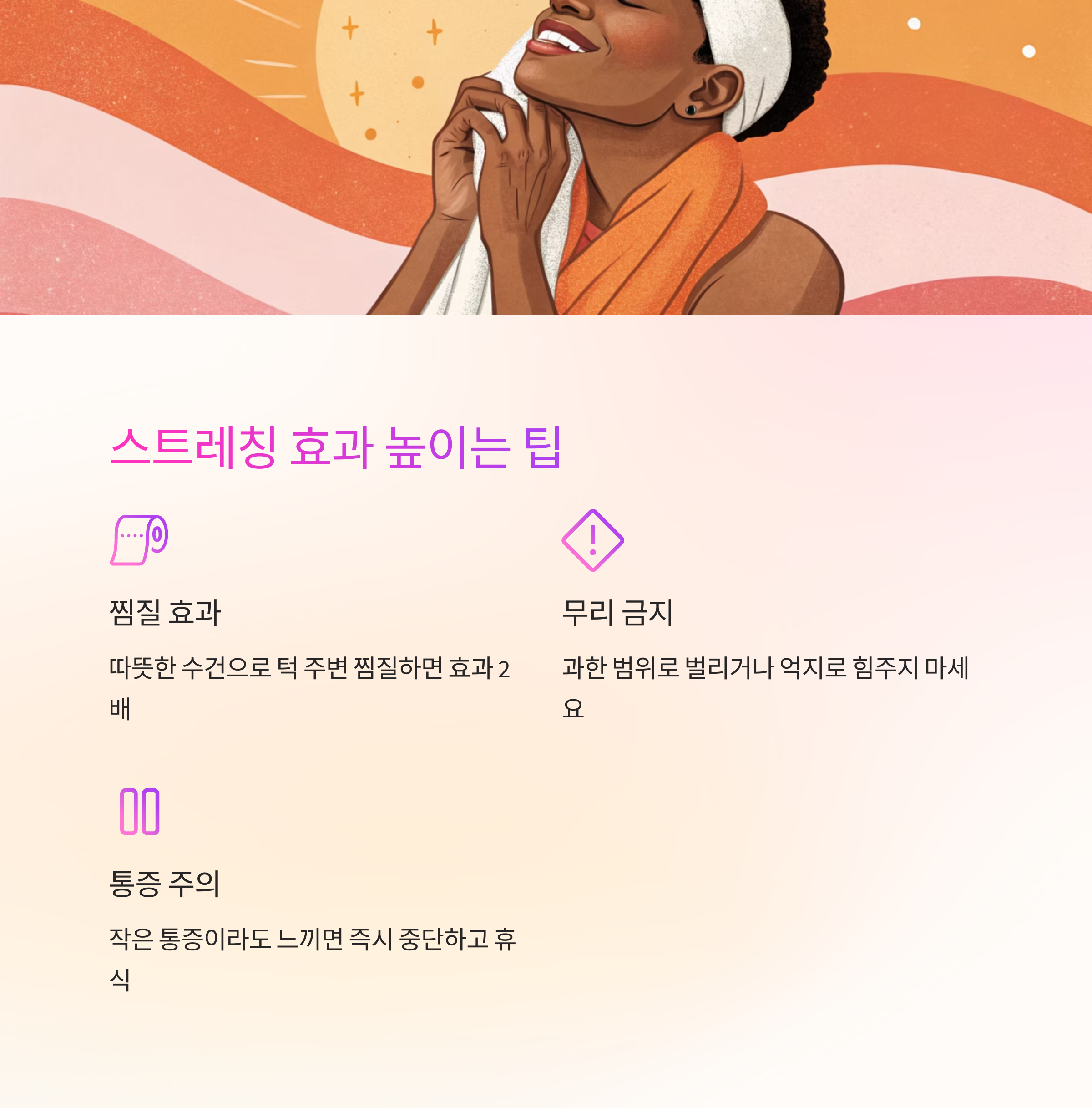 - 스트레칭 전 따뜻한 수건으로 턱 주변 찜질하면 효과 2배! - 절대 과한 범위로 벌리거나 억지로 힘주지 마세요. - 작은 통증이라도 느끼면 즉시 중단하고 휴식!