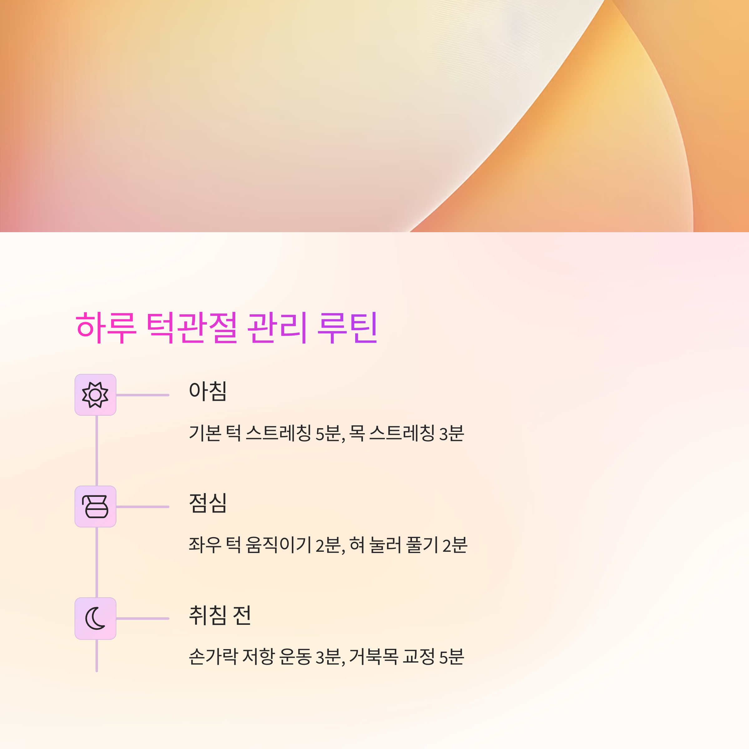 아침 기상 후 ☀️ - 기본 턱 스트레칭 5분 - 목 스트레칭 3분 점심시간 전후 🌤️ - 좌우 턱 움직이기 2분 - 혀 눌러 풀기 2분 잠들기 전 🌙 - 손가락 저항 운동 3분 - 거북목 교정 스트레칭 5분 👉 하루 총 20분 투자로 턱과 목 건강 모두 챙길 수 있습니다!