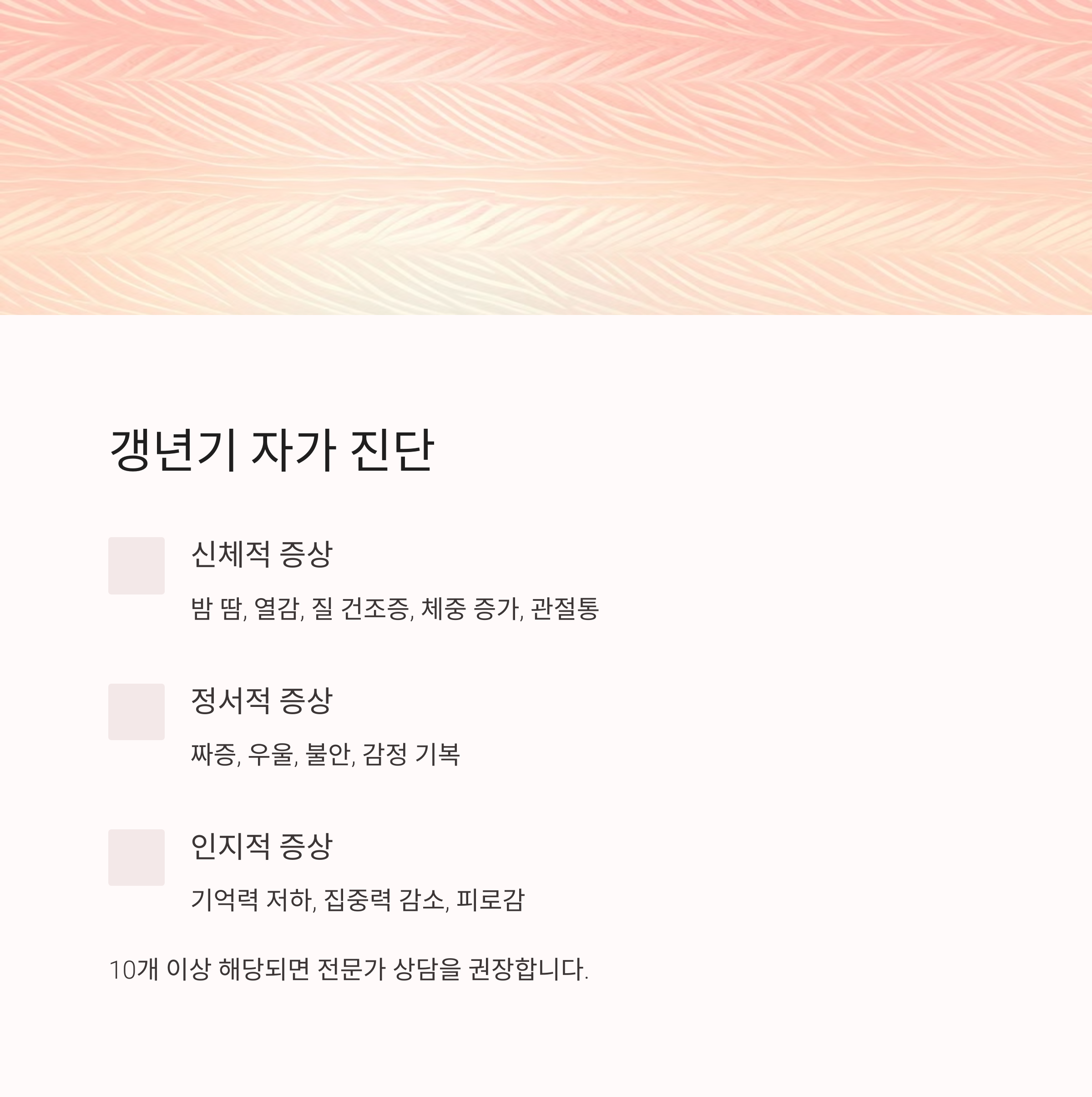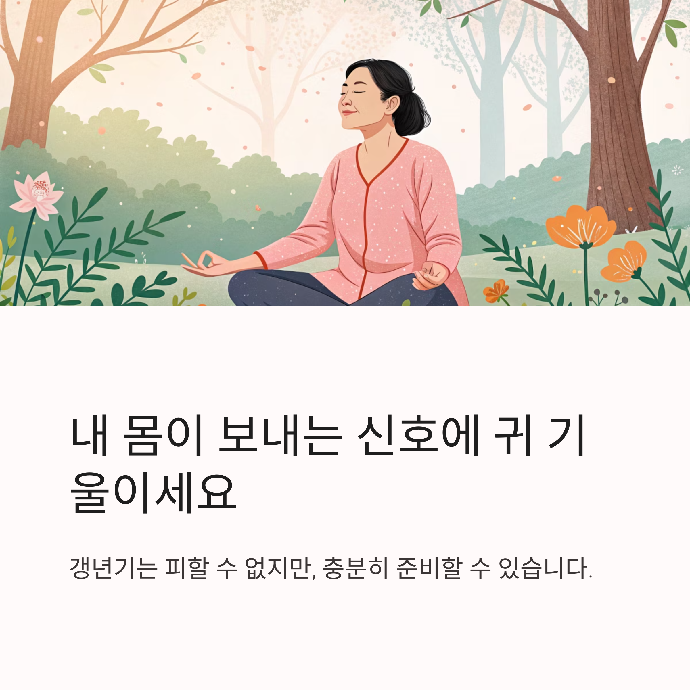 오늘은 갱년기 자가 진단표를 통해 내 몸과 마음이 보내는 신호를 체크해보고, 초기 증상부터 관리법까지 함께 살펴보겠습니다.